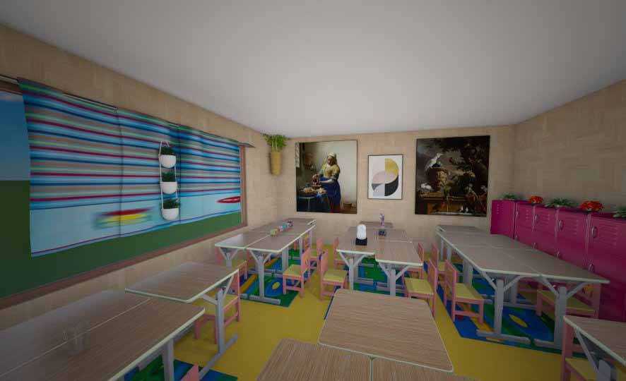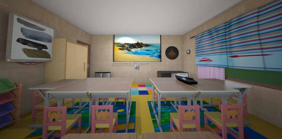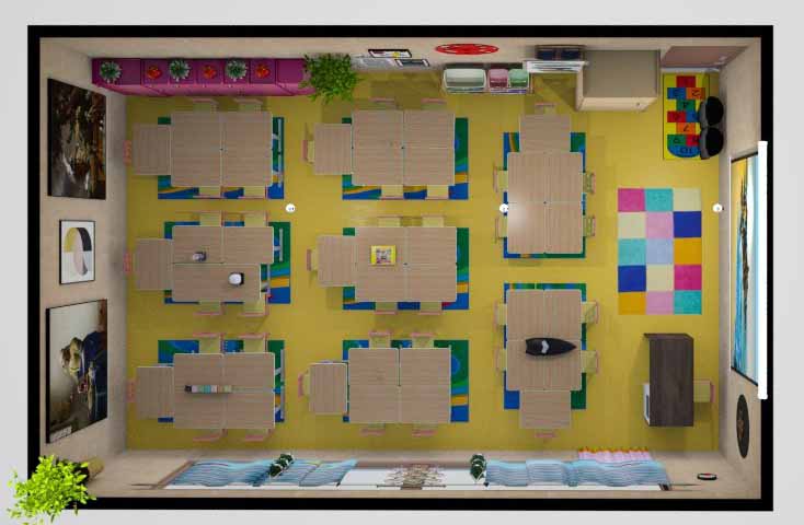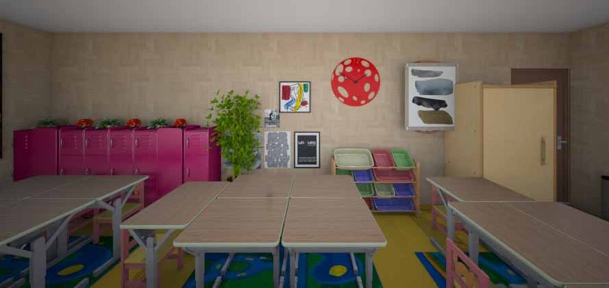 La segunda fase consistió en la distribución de las cuarenta sillas con sus mesas de tal forma que lográramos optimizar el espacio, crear grupos para promover el trabajo cooperativo y en esa línea, mejorar la implementación de pedagogías activas que se han incorporado este periodo académico en los proyectos artísticos. Se organizaron ocho grupos de cinco muebles sin perder la movilidad por el aula, la ubicación adecuada para las orientaciones generales, la visibilidad con las imágenes que se proyectan y el acceso a materiales del mueble que tenemos para la clase. Los resultados a continuación: