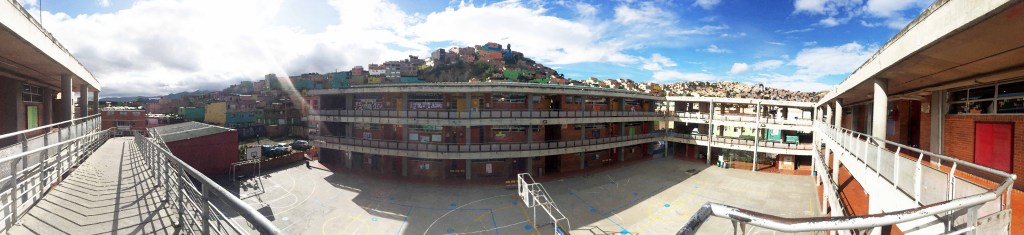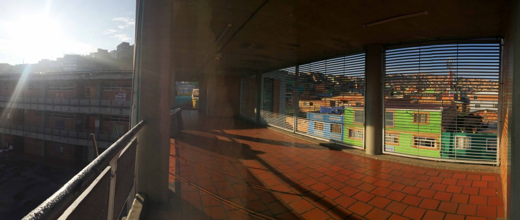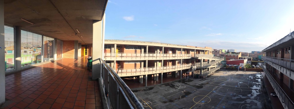Los pasillos del colegio resultan ser, en ocasiones, más acogedores que las aulas: La Luz, el espacio abierto y las posibilidades de ser flexible. Moverse sin barreras, ubicarse voluntariamente eligiendo el lugar que más le agrada para compartir con sus compañeros. Uno de los pasillo especiales en el cole, está ubicado en el tercer piso y normalmente permanece así como en la imagen: vacío. Porque «no se puede estar por fuera de los salones» a menos que estén super controlados, en actividades con profesores que los puedan monitorear todo el tiempo. Sin embargo, los estudiantes aprovechan el cambio de clases y ponen a rodar un tarro plástico o una bola improvisada con papel y se juegan sus «picaditos» relámpagos de fútbol de pasillo.