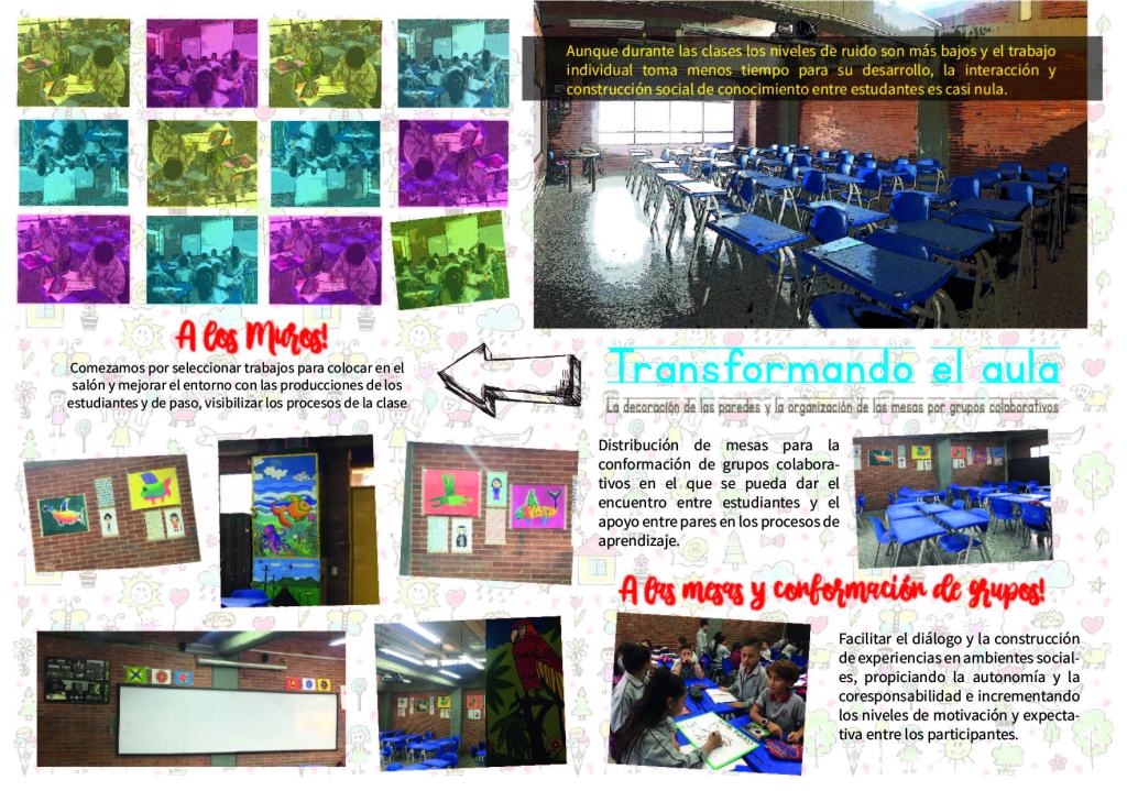 Sin embargo, con algunas experiencias implementadas como la disposición de mesas en grupos, el cambio de espacios “especializados” para profundizar los aprendizajes de otros campos, el diseño de estrategias que obligan la integración y circulación de la comunidad en distintos escenarios, incluso, el cambio de color en algunos muros; se ha logrado poner sobre la mesa la urgencia de un cambio en los espacios escolares, más aún, cuando cada vez más lo estudiantes, la comunidad educativa y la sociedad en general, presionan sobre los aprendizajes que se requieren hoy para estar más dispuestos a afrontar los retos del mañana.