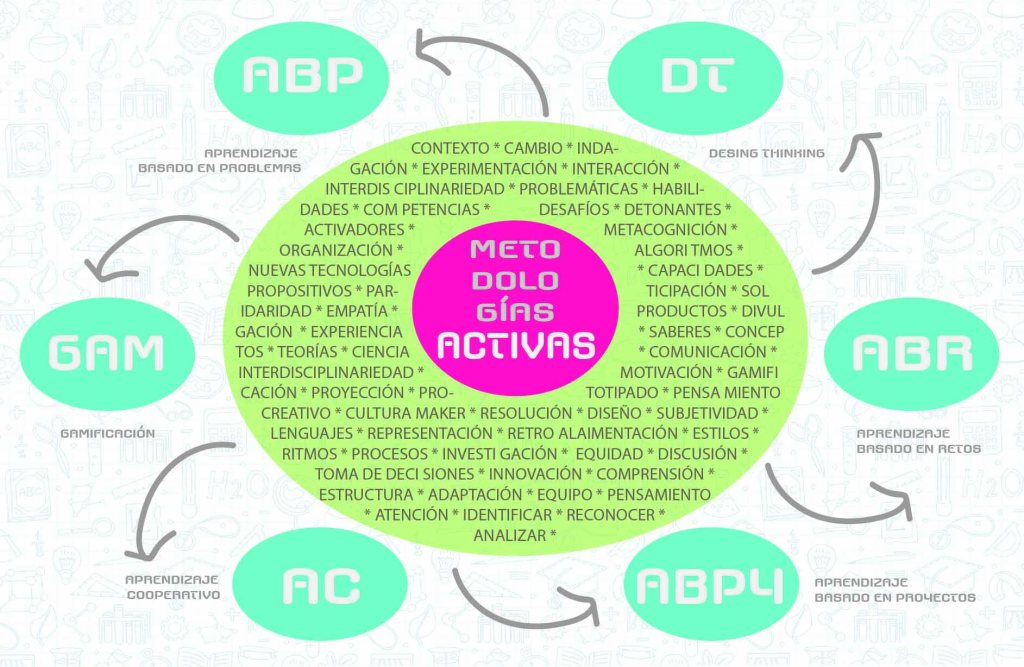 A continuación se comparte un gráfico en el que se presentan las metodologías activas que se implementan en la clase de Educación Artística y que interactúan a lo largo y ancho de los proyectos y ambientes de aprendizaje en el ciclo 3.
