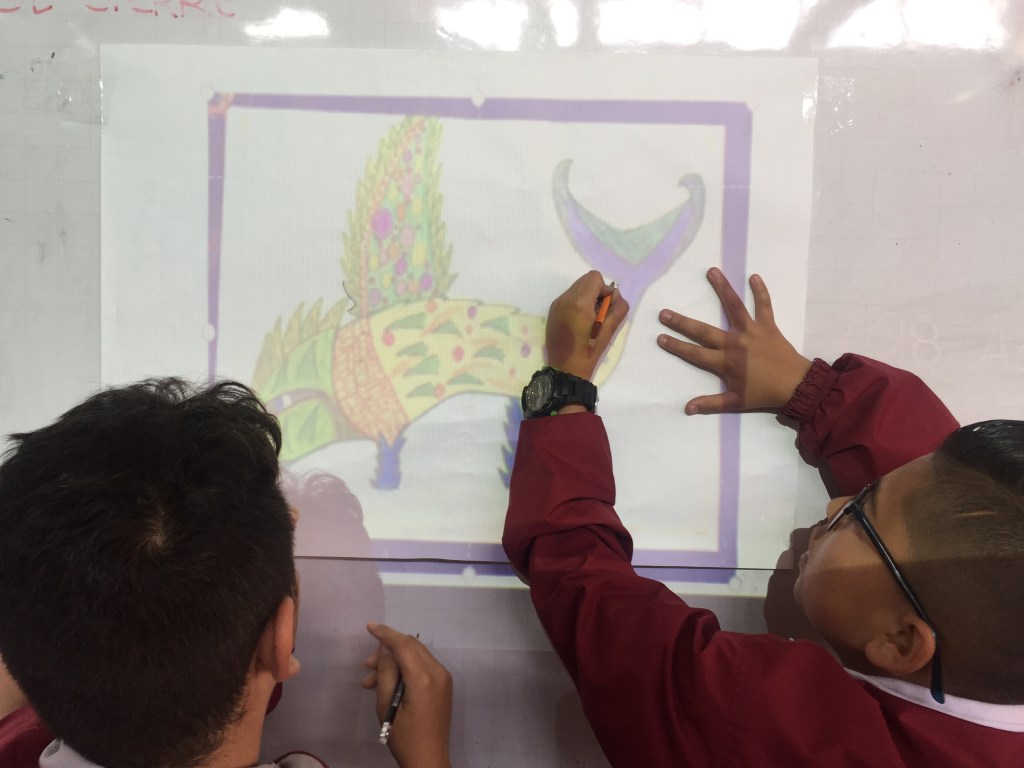 La primera fase correspondió a la selección de trabajos para visibilizar y fijar en las paredes del salón. Comenzamos por intervenir los muros del salón. Lo interesante aquí fue darle un espacio a varios proyectos de clase de distintos grados que permanecían guardalados para una ocasión tan relevante como esta: Fotografías, dibujos, pinturas se organizaron en algunos espacios para mejorar el ambiente. Tal vez lo más interesante de esta etapa fue abrir un sinnúmero de posibilidades para que en adelante, se sigan adoptando no solo en este espacio, también en otros salones más.